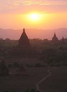 世界3大仏教遺跡のひとつバガンの遺跡群観光: バランスのとれたアーナンダ寺院、バガンで一番高いタビィニュー寺院、 黄金に輝くシュエジーゴンパゴダ、伝統工芸漆工房など。 パゴダに登って夕日鑑賞