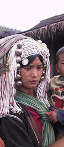 山岳民族のアカ族の女性は銀細工の付いた独特の帽子をかぶって 生活しています。 村によっては、仏教、キリスト教、土着信仰が共存しています。